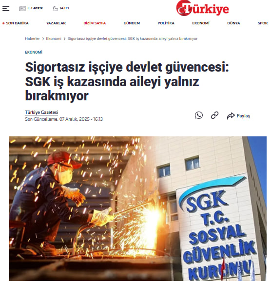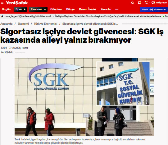 Kocaeli Dilovası’nda yedi işçinin yaşamını yitirdiği katliamın ardından sigortasız çalıştığı anlaşılan işçilerin SGK tarafından bir günlük sigortalı sayılması tepkilere neden oldu. Sabah, Yeni Şafak, Türkiye ve Diriliş Postası ise Dilovası’yla yeniden gündeme gelen uygulamayı “Sigortasız işçiye devlet güvencesi” başlığıyla haberleştirdi. SGK’nin denetim sorumluluğunun üstünü örten uygulama “işçi ve ailesini koruyan güçlü bir sosyal devlet refleksi” olarak lanse edildi